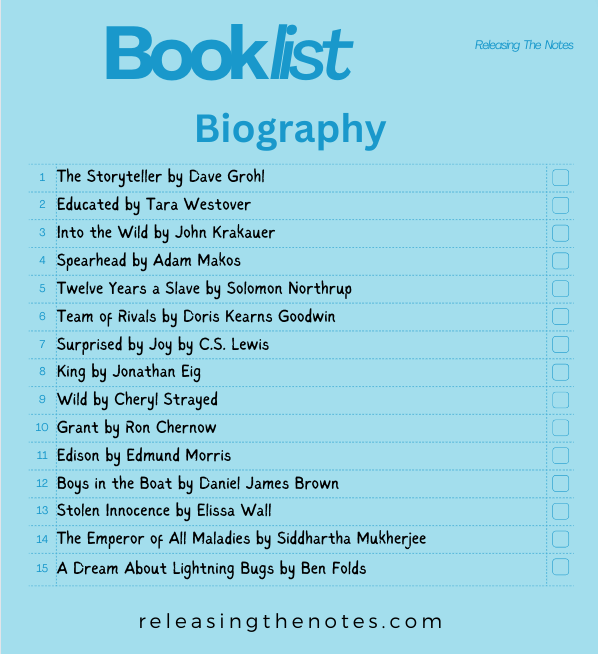 In this list, I have chosen to include biography, autobiography, and memoir together and use biography as an umbrella term for the three. I realize there are differences and nuances between the three, but those lines are blurred in this list.